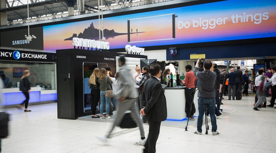 O Samsung Note8 é grande e arrojado, assim como a campanha de dominação em Waterloo com uma parede digital gigante e a oportunidade de experimentar o dispositivo, a edição de fotos e VR no local | JCDecaux Reino Unido.