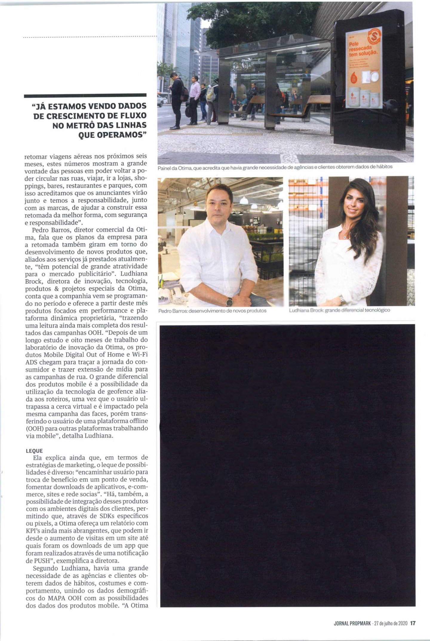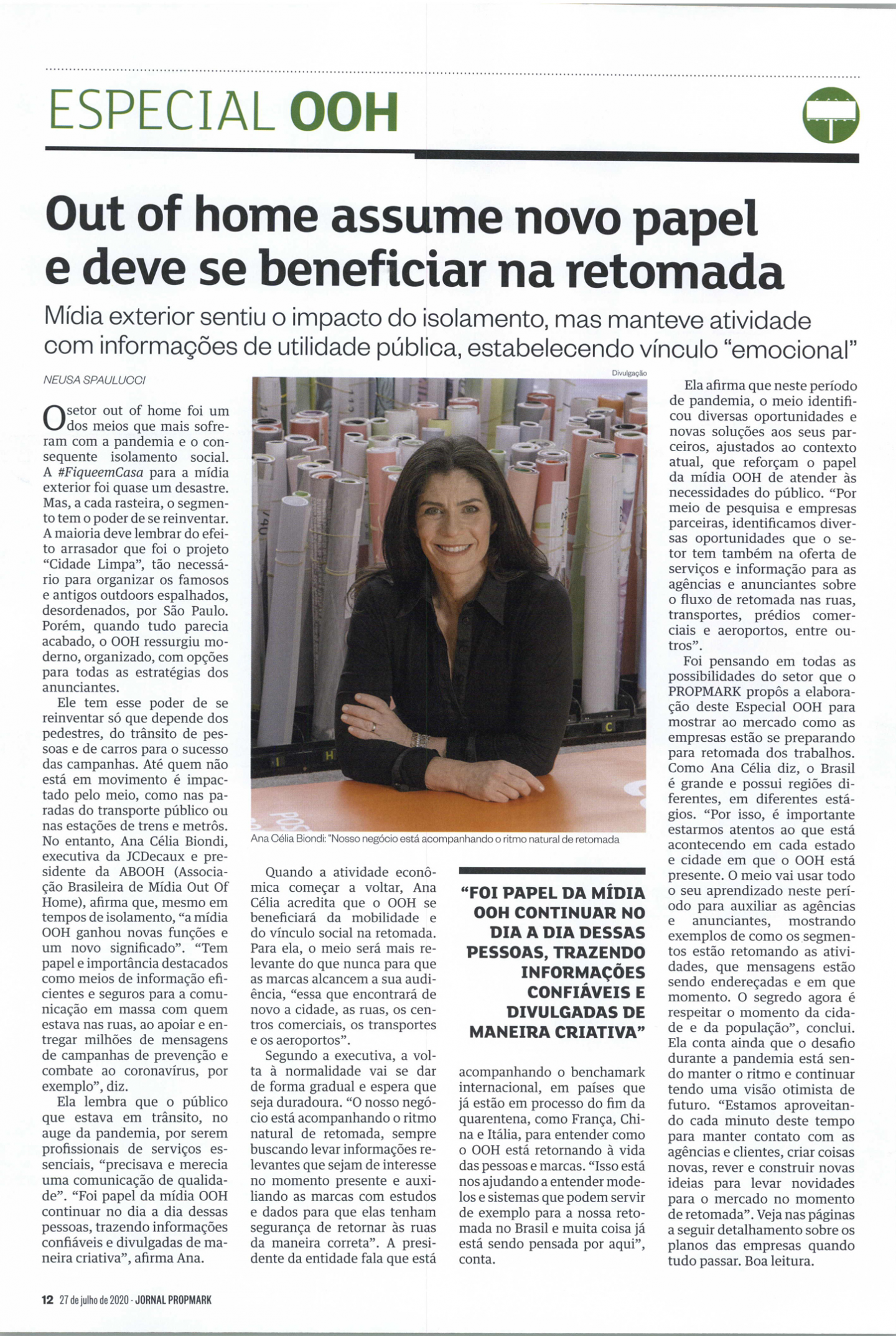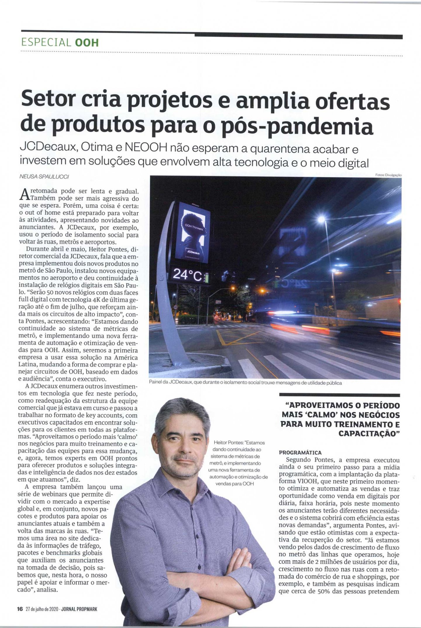 Em matéria especial do Propmark, Ana Célia Biondi, CEO da JCDecaux do Brasil e presidente da ABOOH, fala sobre a importância da mídia OOH mesmo na pandemia e a sua capacidade de se reinventar. Também na mesma edição, Heitor Pontes, Diretor Comercial, conta sobre o preparo para a retomada da JCDecaux com investimentos em tecnologia, novos produtos, entre outros.